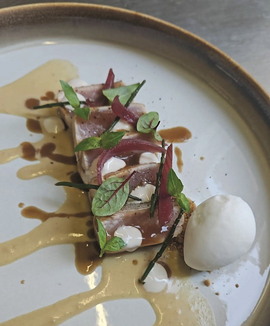 Adagiare la salsa tonnata al centro del piatto, dopodichรฉ inclinarlo e batterlo finchรฉ la salsa non inizia a colare. Appoggiare nella parte superiore della salsa il filetto di pesce scaloppato e condirlo con olio, sale di Maldon e pepe di Sichuan. Guarnire con maionese di bottarga, salsa teriyaki e cipolla in agrodolce. Finire con una querelle di sorbetto al finger lime.
