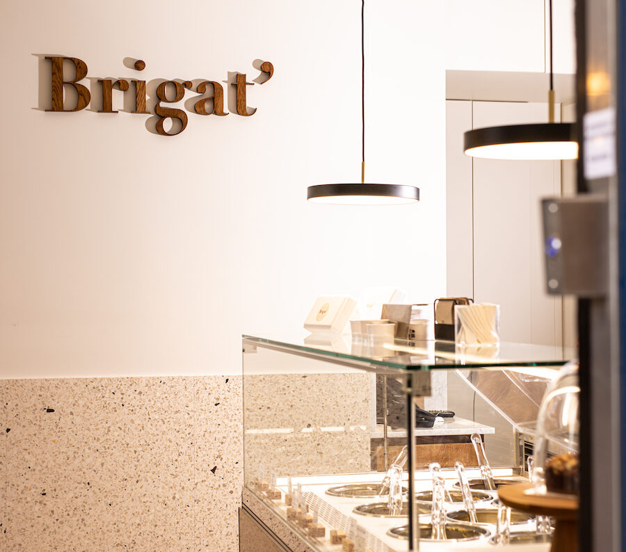 Il marchio Brigat oggi si declina anche nella gelateria, in uno spazio adiacente alla prima boutique sullโaffollata rue du Pas de la Mule, a due passi dalla Place des Vosges, dove si trova lโofferta pasticcera e di panetteria