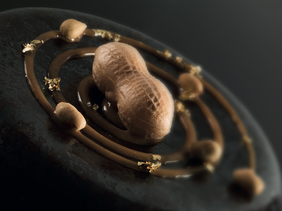 In alto, Arachide, cialda di riso, gelato al Caramรฉlia 36%, salsa di zucchero bruciato e arachidi leggermente salate. Nel libro “Tra l’onirico e il reale” (Chiriotti Editori) – Foto Giancarlo Bononi