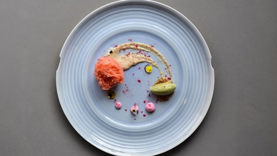 Gelati al piatto Cioccolato Ruby, pane e gelato di pistacchio Spugna di fragola, salsa di pane, cioccolato Ruby e gelato di pistacchio Davide Oldani per l'iniziativa Il Cioccolato Buono, promossa dal Chocolate Academy Center Milano