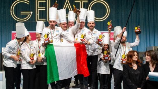 Primo posto per lโItalia alla Gelato World Cup, il campionato del mondo organizzato da Gelato Cultura e Italian Exhibition Group, di scena a Sigep Rimini 2024. In squadra, Vincenzo Donnarumma, Rosario Nicodemo, Filippo Valsecchi, Domenico di Clemente e Davide Malizia.