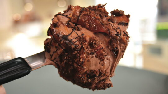 Per il gelato al cioccolato sceglie solo massa di cacao, mentre il pan di Spagna รจ sostituito da un crumble fondente; la glassa originale…
