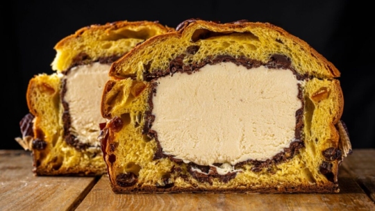 Giuseppe Bassanelli, de I Mannari, gelateria nel quartiere Montagnola a Roma, svuota il panettone e successivamente lo glassa nella…