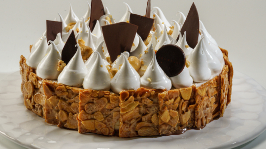 Gelato alla nocciola, Crema Brunelli, gelato al cioccolato, croccante di mandorle e meringa