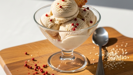 Un gelato raffinato a base di latte di bufala, dove la dolcezza delicata si intreccia con il fascino aromatico del pepe rosa (noto anche come โfalso…