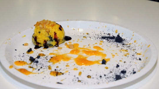 Sorbetto al mango e al cocco, gelรฉ Pabana, parfait alla banana, confettura d'anans. Mousse di gelato, meringa e crumble al cocco.