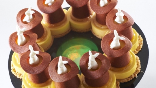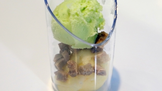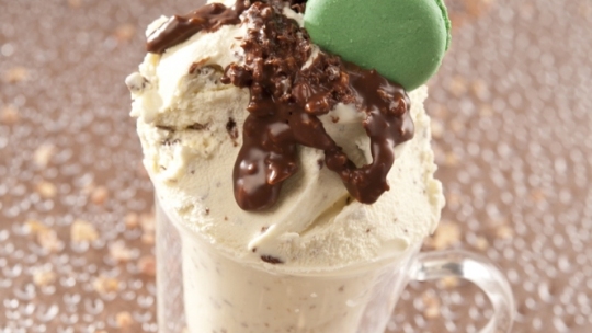 Gelato alla crema vaniglia, variegato nocciola e cioccolato al latte e macaron al pistacchio ed assenzio. Alessandro Racca