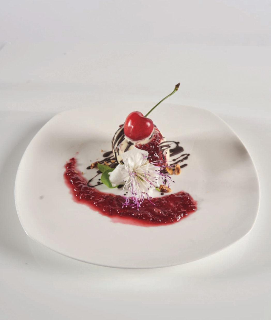 Pastorizzare la miscela di latte, panna, zuccheri, Marsala e latte scremato in polvere. Preparare una riduzione di ciliegie e mantecare. Spolverare con cacao e copertura di cioccolato.