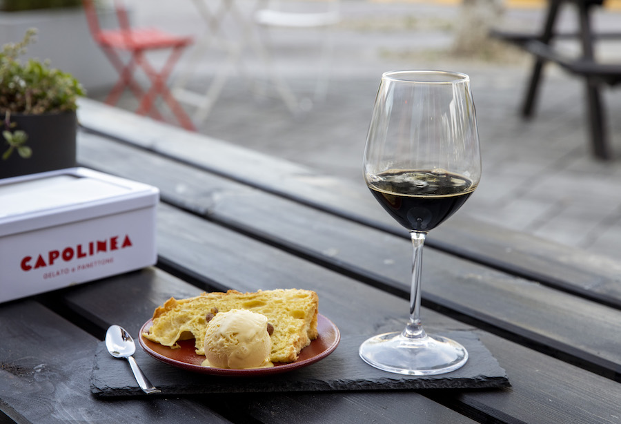 Prima di approdare a risultati che lo soddisfacessero, il titolare di Cremeria Capolinea ha dedicato un lungo periodo alla sperimentazione, estraendo i caffè con infusione a freddo o con il metodo espresso e realizzando sorbetti e gelati, sia in purezza che con aggiunta di ingredienti (come cacao, limone, scorze d’agrumi, polvere di buccia di pomodoro, maggiorana) in grado di amplificarne le qualità sensoriali. Il 5 giugno abbiamo avuto l’occasione di scoprire in anteprima le nuove proposte (che saranno lanciate una alla volta nel corso delle prossime settimane) durante una degustazione guidata presso il Circolino del pane a Milano, in abbinamento a quattro specialty coffee monorigine estratti a filtro, forniti dalle torrefazioni italiane Brisa Coffee Roaster (Etiopia), Caffè Terzi (Costa Rica), Gearbox e Bugan Coffee (questi ultimi entrambi colombiani), scelte da De Feo “innanzitutto sulla base del rapporto umano con chi le gestisce, oltre alla professionalità e agli skill tecnici nel selezionare la materia prima e nel lavorarla, operazioni non facili”. Tra i pairing non poteva mancare il panettone – altro fiore all’occhiello di Cremeria Capolinea – declinato all’amarena e caffè (presente nell’impasto sia in forma liquida che in polvere), abbinato a un caffè filtro Colombia con particolari note aromatiche conferitegli dalla fermentazione insieme a ciliegie disidratate.